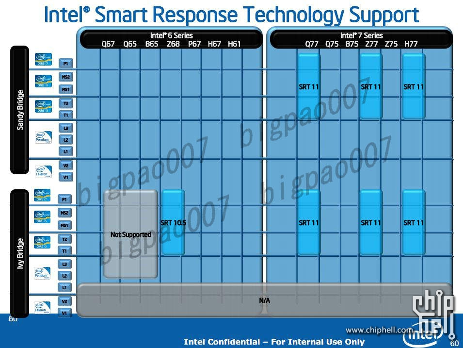 Tramite i nuovi chipset della serie 7, verrà inoltre aggiornata la tecnologia SRT (Smart Response Technology) alla versione 11. La nuova tecnologia avrà come prerequisito non solo i chipset mostrati in figura, ma anche i processori di fascia più alta, mentre non sarà disponibile per gli Intel Pentium.