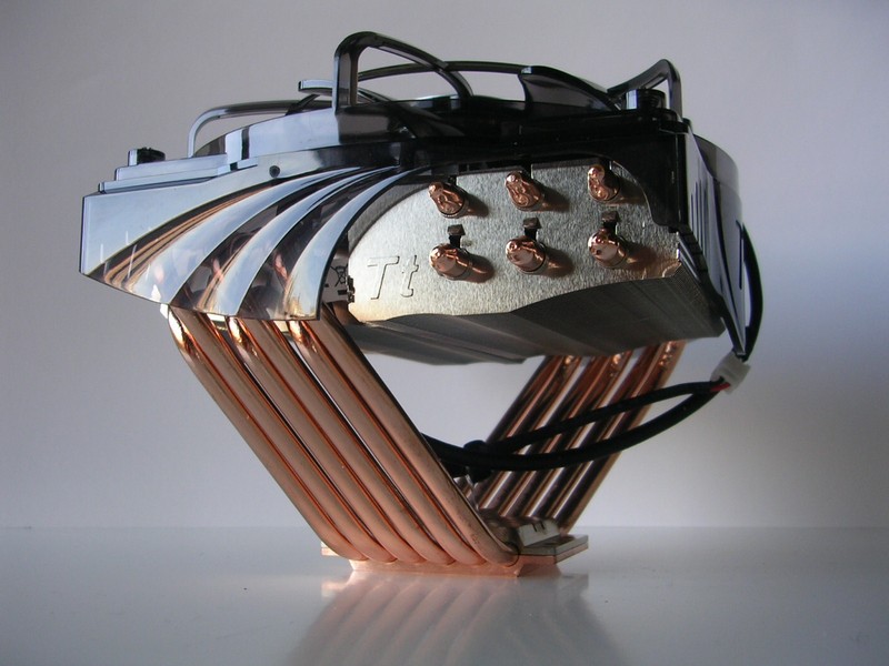 Mantenendo la struttura “sopraelevata” con la base in rame connessa al corpo dissipante in alluminio soltanto dalle heatpipes, le novità si manifestano soprattutto nel maggior numero di heatpipes (passato da 4 a 6) e nella ventola più grande (da 12cm a 14cm) che ha portato a un inevitabile accrescimento del corpo del dissipatore stesso. ThermalTake ha confermato anche la sua propensione alla cura dell'estetica con l'introduzione di LED blu nella ventola a pale semitrasparenti.