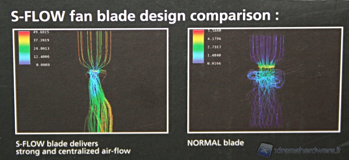 - Struttura a torre ottimizzata: in fase di progettazione si è scelto di modificare la parte centrale del dissipatore stesso, in quanto la presenza di rientranze ondulate permettere di ammorbidire il profilo acustico delle ventole e di ottenere un migliore flusso dell’aria nella zona centrale del radiatore. Quest’ultima viene investita trasversalmente dall’ottima "Akasa Viper PWM" “S-Flow” da 12cm, caratterizzata da un quantitativo elevato di pale (ben 9) ed un rapporto tra CFM/dB ottimizzato in funzione di un elevato carico sulla CPU. Inoltre è da menzionare il fatto che ogni pala presenta una struttura tridimensionale tale da permettere un miglioramento del 30% del CFM a parità di rotazione, cosa che come vedremo inciderà molto sia sui risultati che sulla rumorosità.