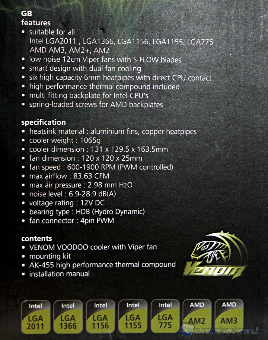 - H.D.T (Heatpipe Direct Touch): la base di contatto presenta le Heatpipes a diretto contatto con l’HIS della CPU e questo permettere di ottenere performance superiori, in linea teorica, rispetto al classico utilizzo derivante da una superficie lappata più o meno a specchio. Diversamente dalla precedente versione, la Vodoo, in questo caso sono presenti 6 heatpipes da 6mm invece che 4 da 8mm. E’ sempre presente un piccolo gap tra le Heatpipes stesse ma approfondiremo dopo la questione.