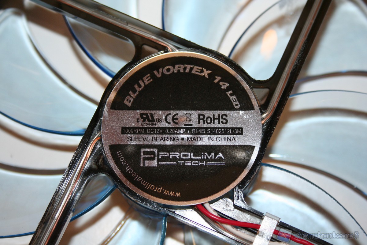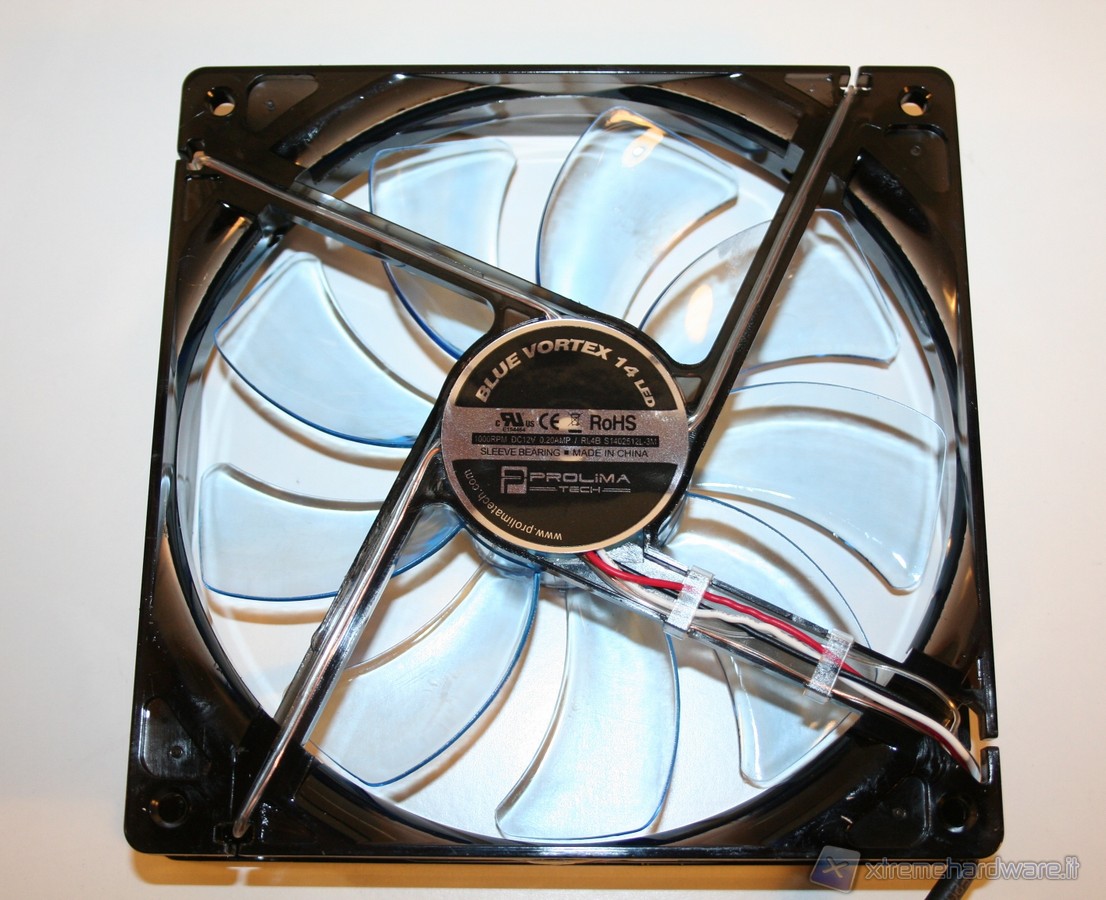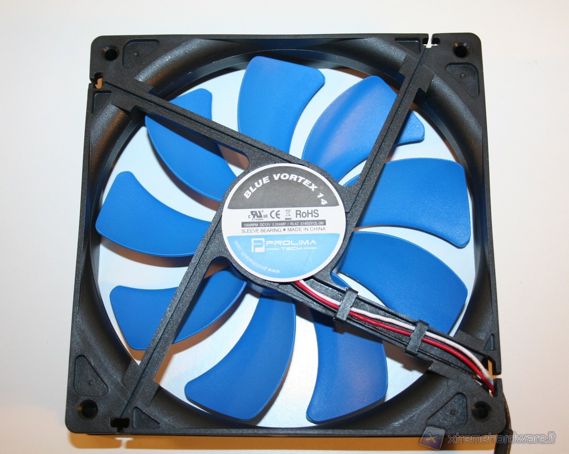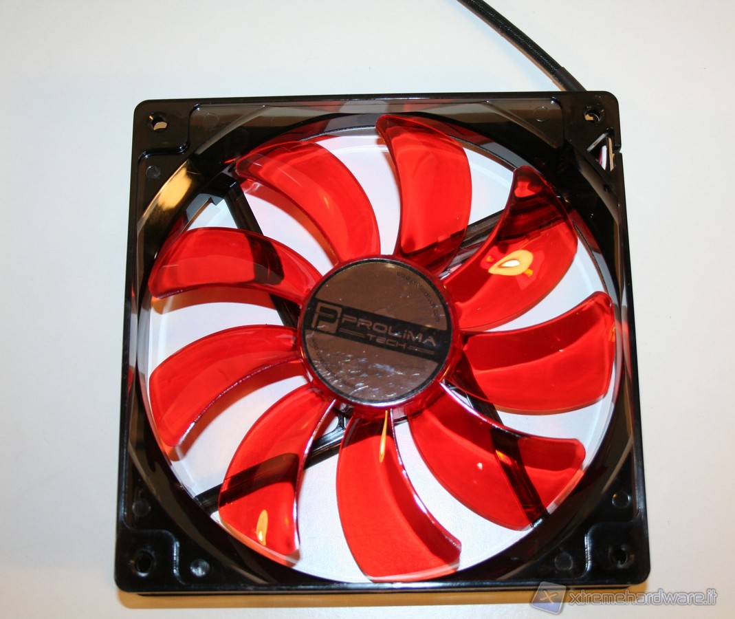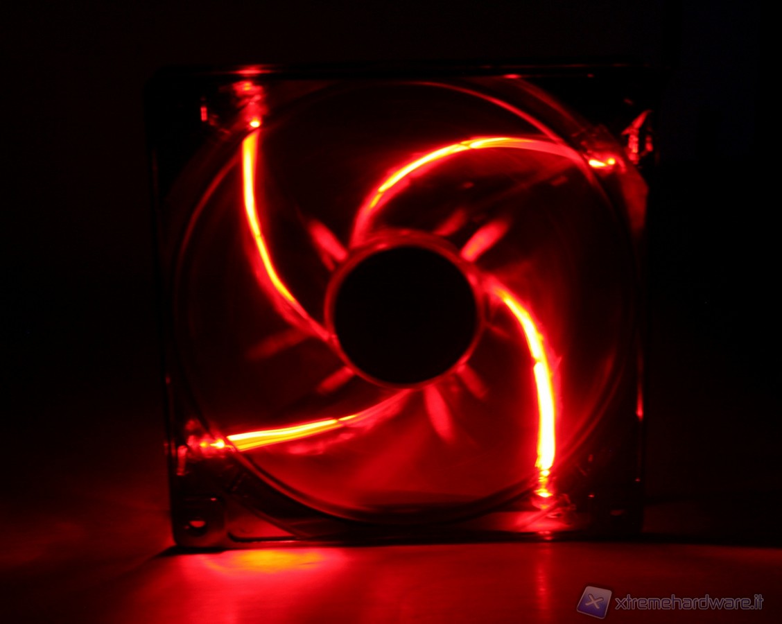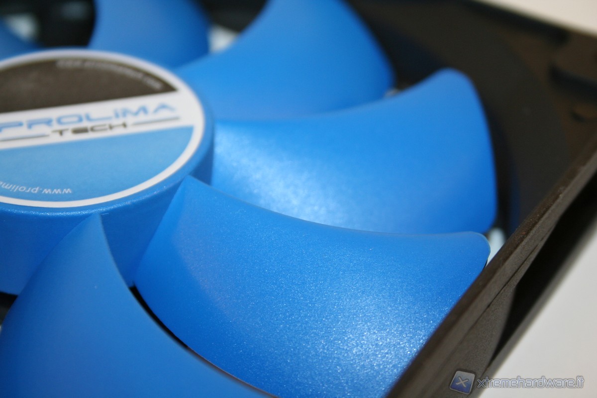 Anche qui la struttura in ABS conferisce un’eccellente solidità strutturale, sebbene però la concezione sia ugualmente classica, a nove pale e senza particolari motifi funzionali proprietari. Lo spessore appunto è standard, però anche qui siamo dinanzi ad un valore di CFM molto elevato per una ventola da 140mm, ma soprattutto ad un rapporto tra dB emessi e CFM molto buono; la rumorosità è bassa e non serve un riduttore. La velocità di rotazione è 1000RPM più o meno 100RPM ed il consumo è pari a 2.4W quindi sarà possibile alimentarla da moltissimi fanbus in commercio, senza il minimo problema.