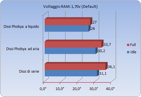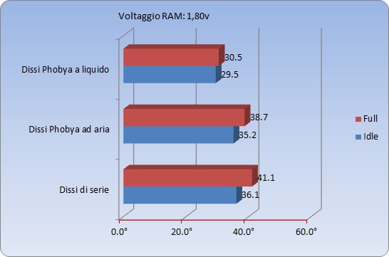 Operando un leggero overclock e portando le RAM a lavorare con frequenze fuori specifica, il guadagno dei dissipatori Phobya si è fatto più marcato. Di seguito i risultati:
