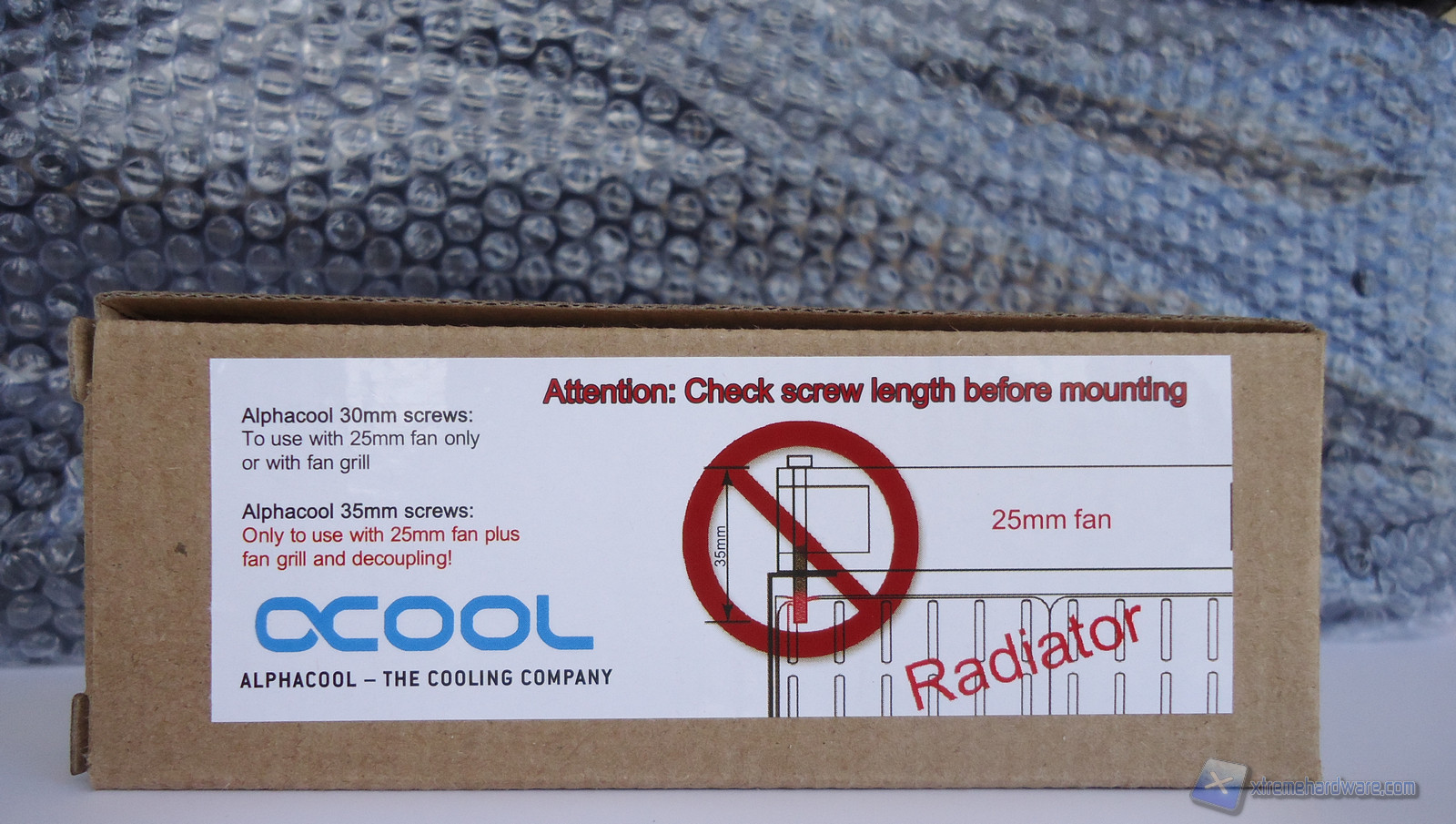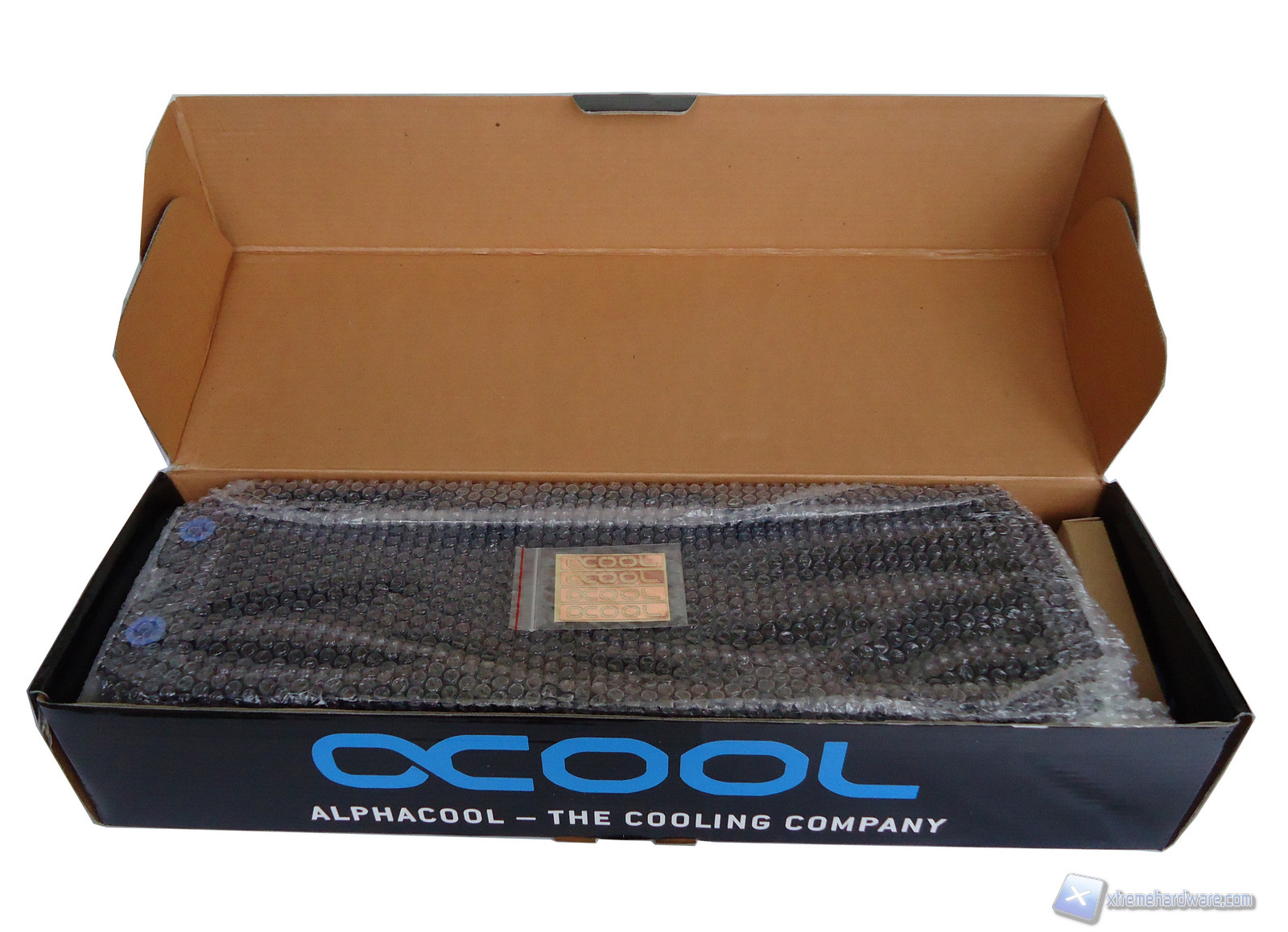 Aperta la confezione troviamo il radiatore avvolto nel pluriball e con delle protezioni di neoprene a proteggerne le estremità; al suo fianco vi è una scatolina di cartone contenente il bundle e poi appoggiati sul pluriball una bustina contenente 4 adesivi con il logo αcool di un’elegante livrea dorata che applicati sul box verniciato matte black, promettono sicuramente un bell’effetto.