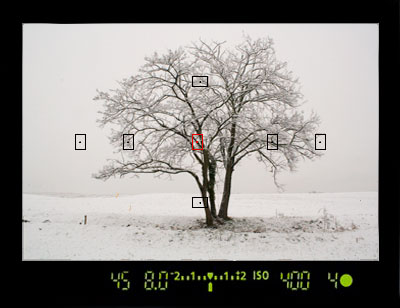 Nel mirino troviamo anche tutte le informazioni relative all’esposizione: velocità otturatore, valori apertura diaframma, blocco AE, livello \ compensazione esposizione, bilanciamento del bianco, valori ISO, conferma messa a fuoco, informazioni sulla scheda SD e l’icona del flash con il suo stato.