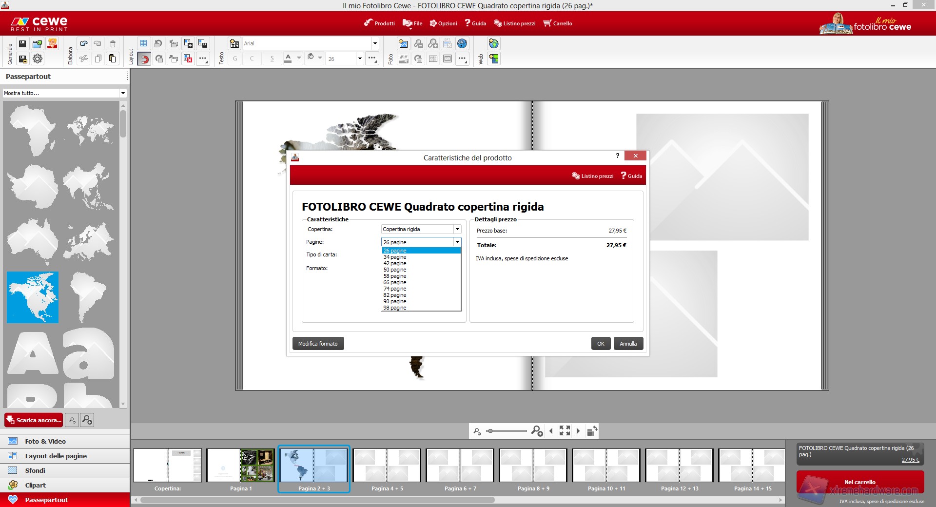 Altre opzioni interessanti le troviamo se apriamo le caratteristiche del prodotto, dove possiamo scegliere il tipo di copertina del nostro fotolibro, il numero di pagine ed il tipo di carta.