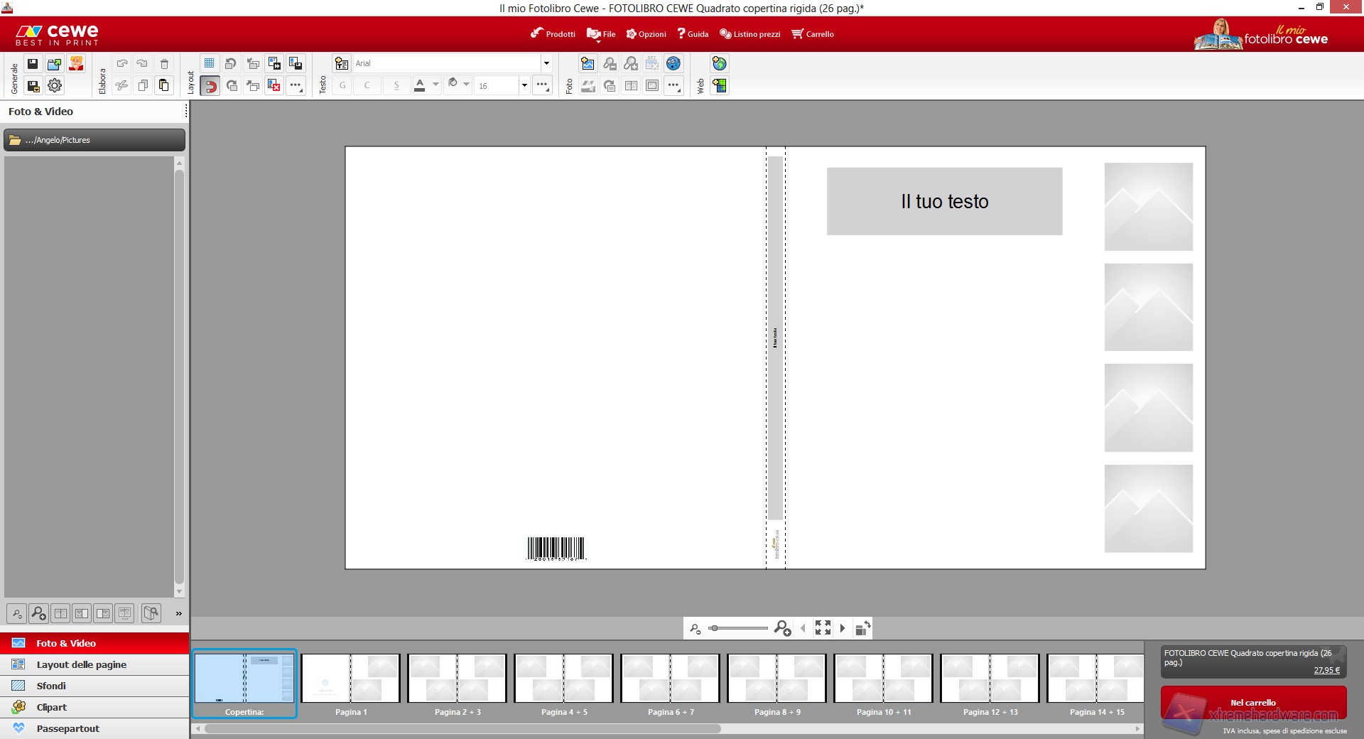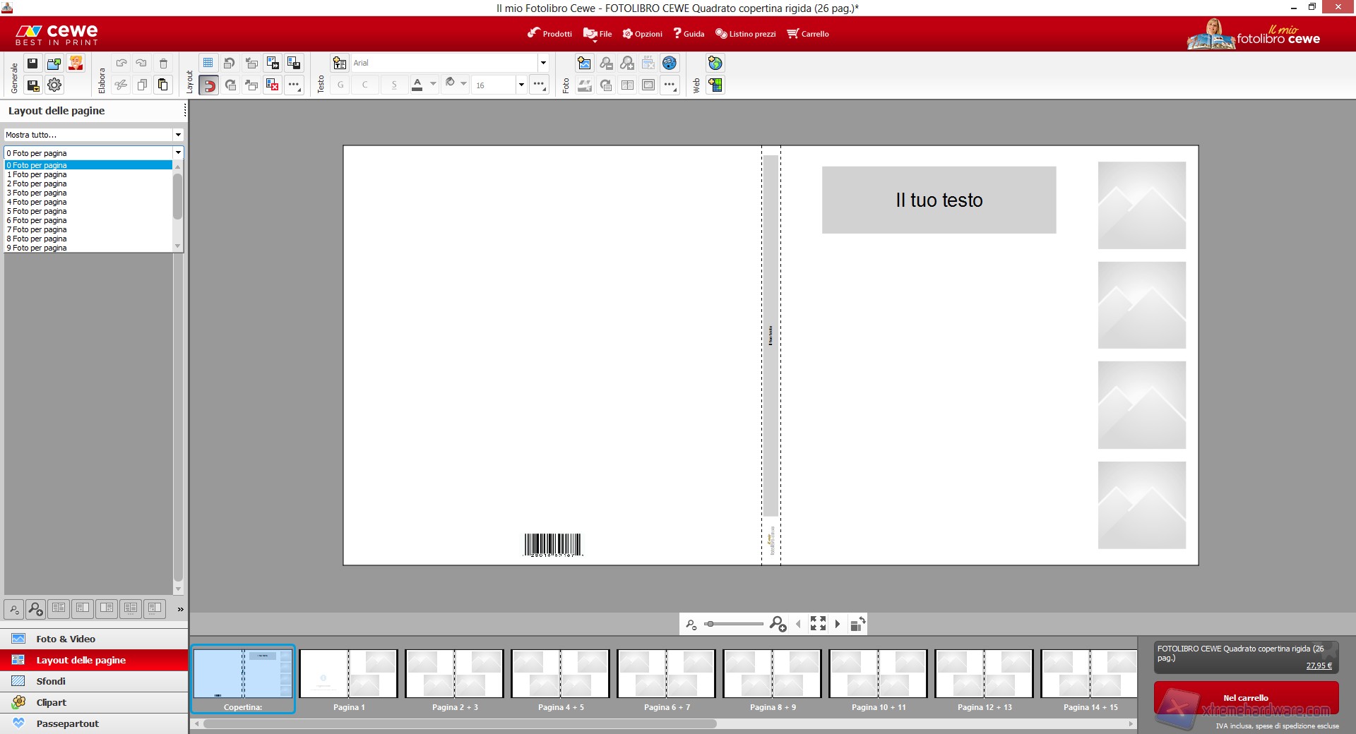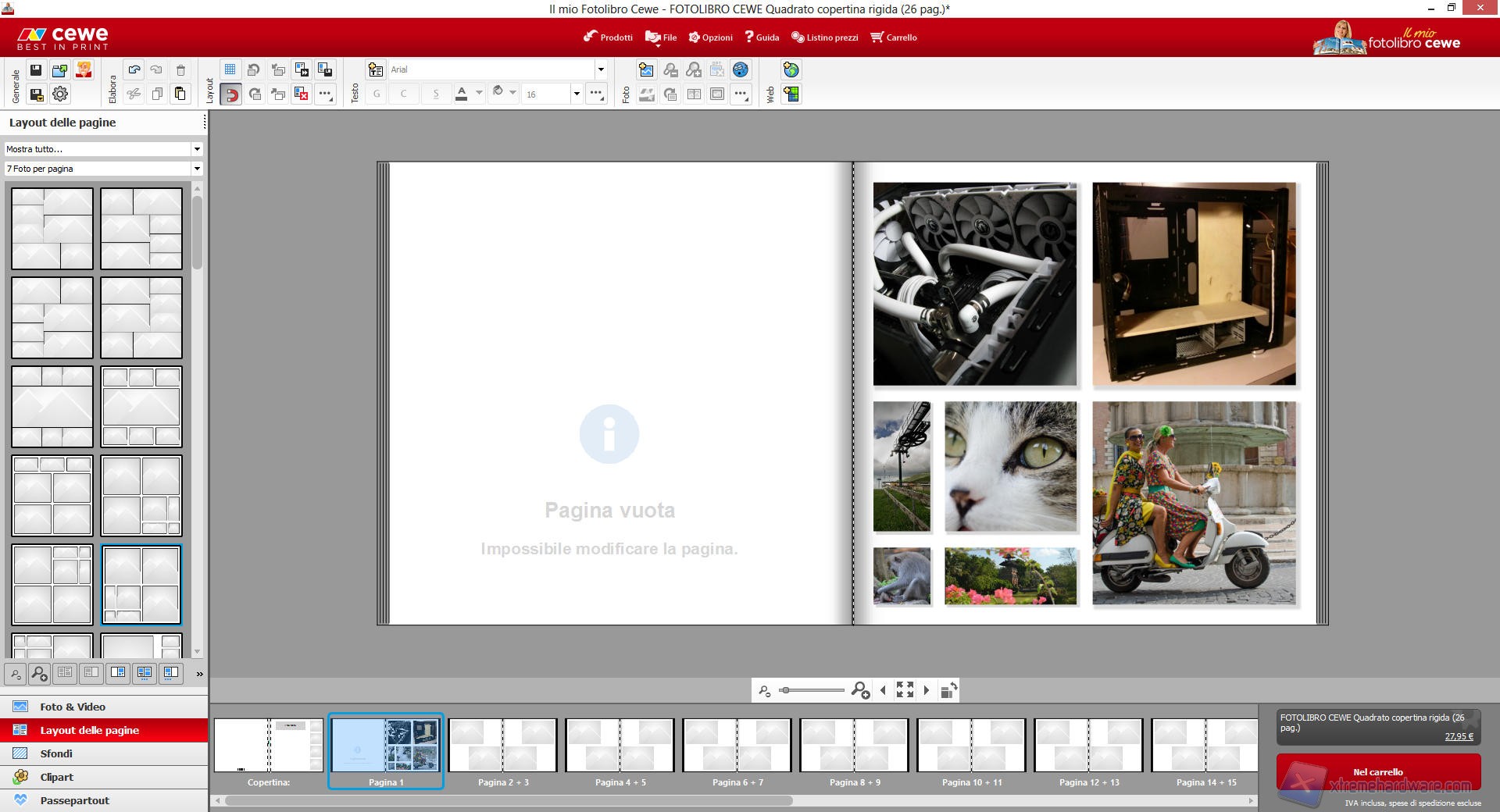Ogni pagina è completamente personalizzabile, possiamo decidere quante immagini mettere, da un minimo di 0 a un massimo di 13 per la copertina e ben 25 per ogni singola pagina, alla disposizione da assegnargli.