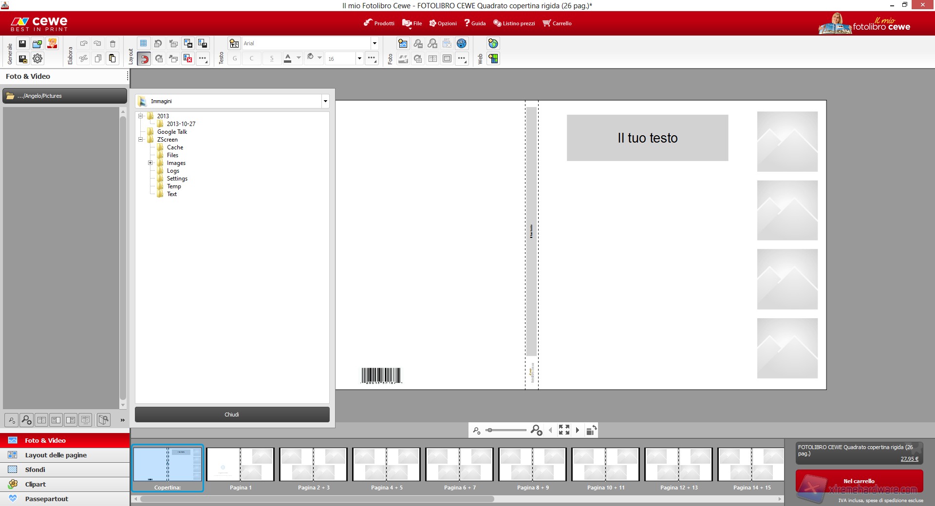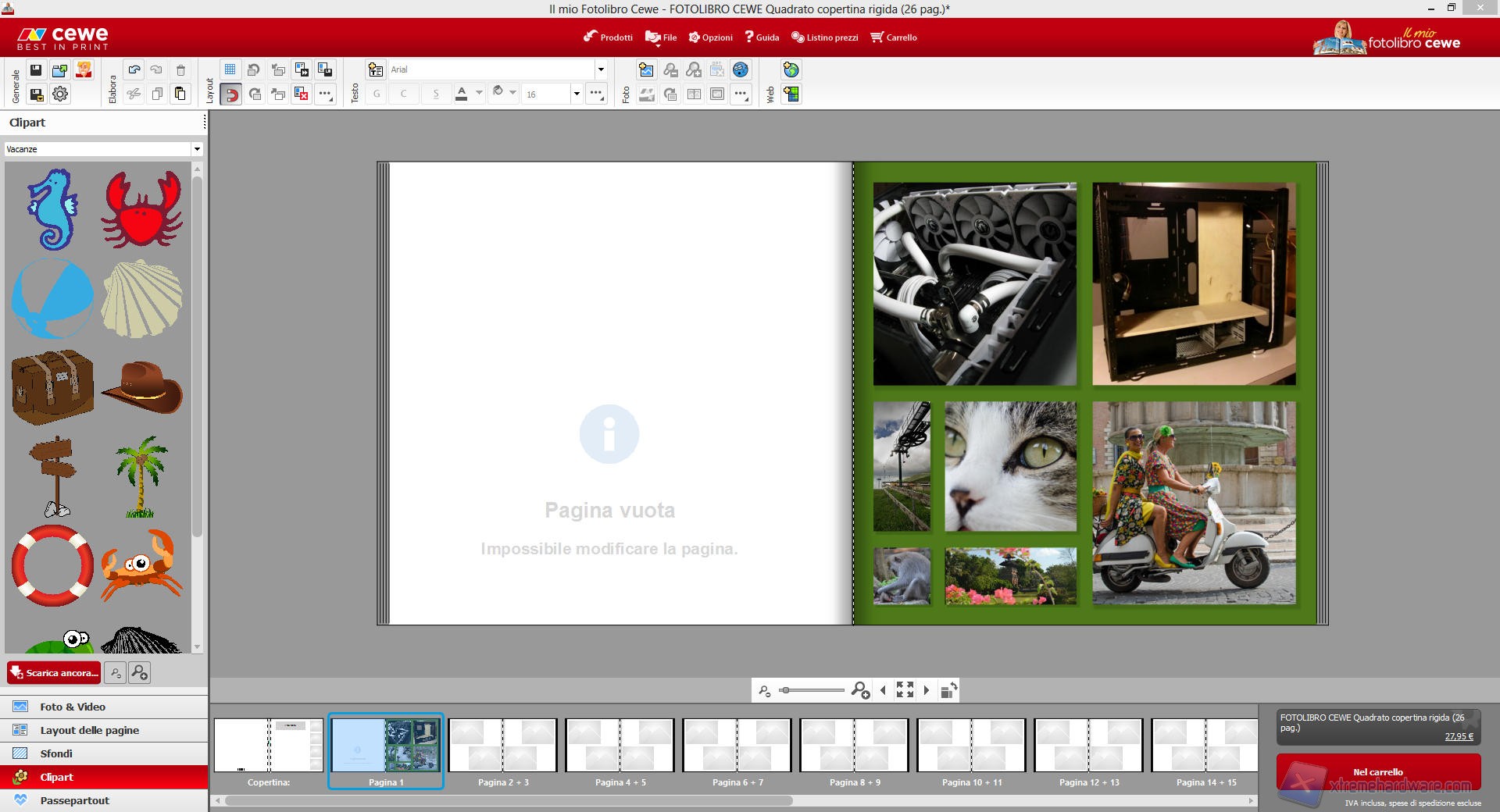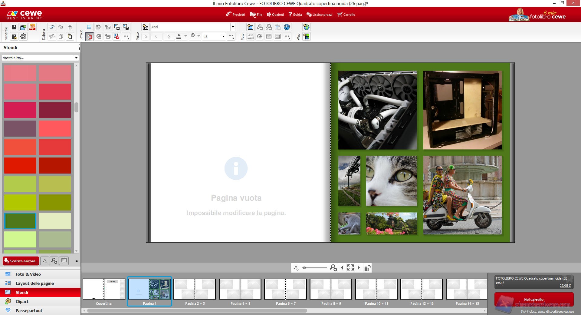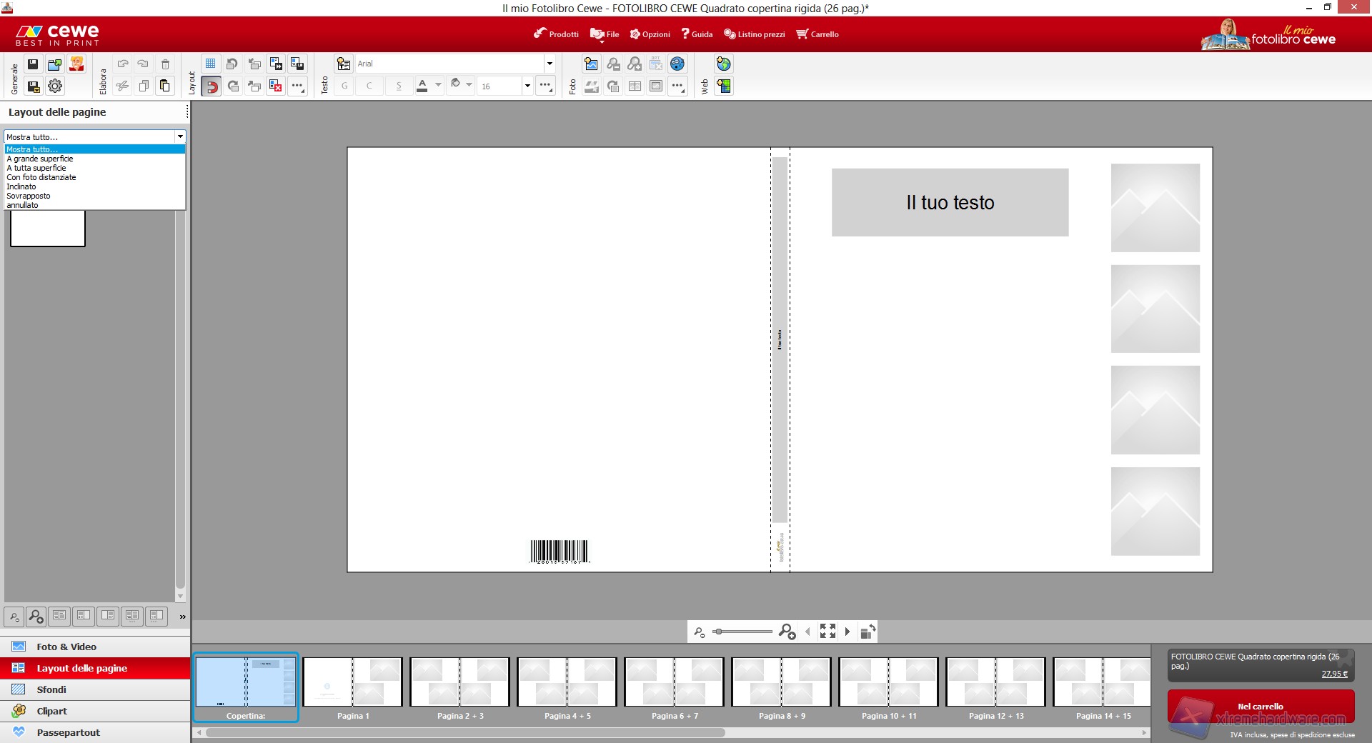 Ogni pagina è completamente personalizzabile, possiamo decidere quante immagini mettere, da un minimo di 0 a un massimo di 13 per la copertina e ben 25 per ogni singola pagina, alla disposizione da assegnargli.