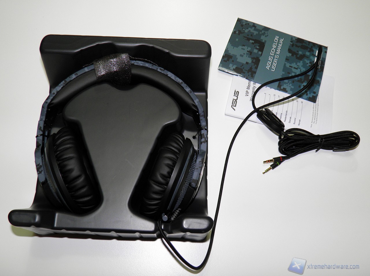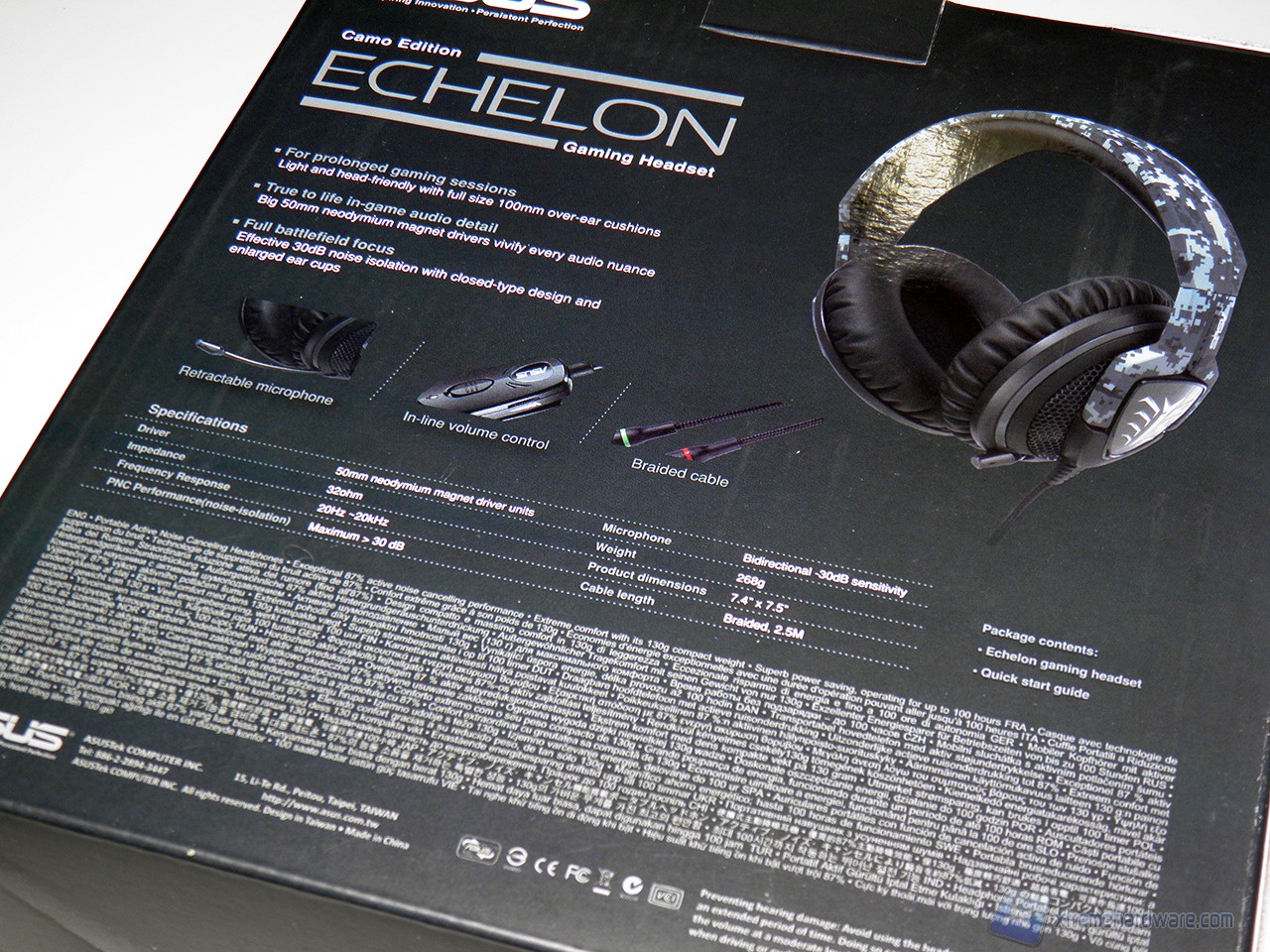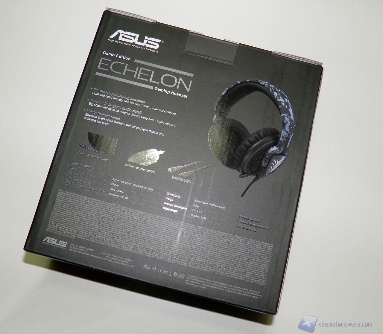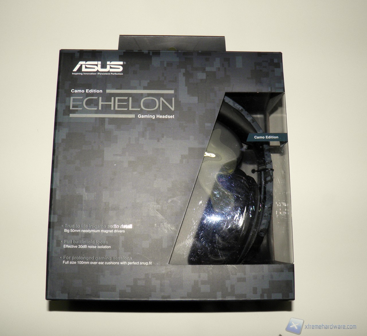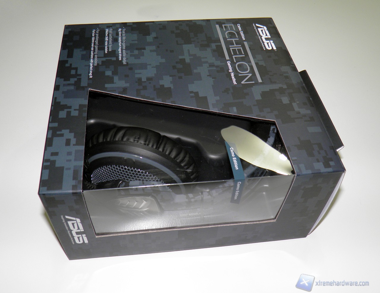 La confezione delle ASUS Echelon vanta la stessa texture Camo che ritroveremo sulle cuffie. Essa   presenta, come sempre, una finestra sul lato destro attraverso la quale è possibile vedere un padiglione delle cuffie protetto ovviamente dal blister plastico. La confezione è davvero molto simile alla precedente, nonché molto diffusa tra i produttori per quanto concerne gli headset audio.