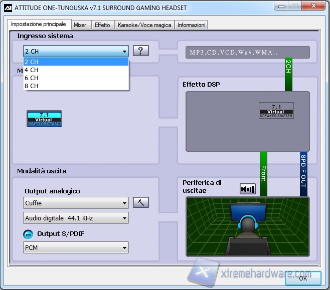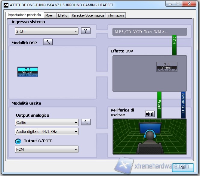 Nella prima tab del programma avremo modo di variare la virtualizzazione dei canali per un massimo di 8 garantendo così il migliore compromesso a secondo dell’utilizzo che ne faremo. Per una riproduzione di un brano audio in mp3 o in altri formati audio si consiglia l’utilizzo a 2 canali ovvero il classico stereo, man mano che saliamo di numero di canali avremo modo di apprezzare suoni in DTS presenti in molti film per terminare ad 8 canali ove il programma stesso ci indica che tale impostazione è adatta ai videogiochi. Inoltre avremo modo di personalizzare tramite la modalita DSP la simulazione di diversi ambienti acustici regolando manualmente i dB di ogni singonolo canale.