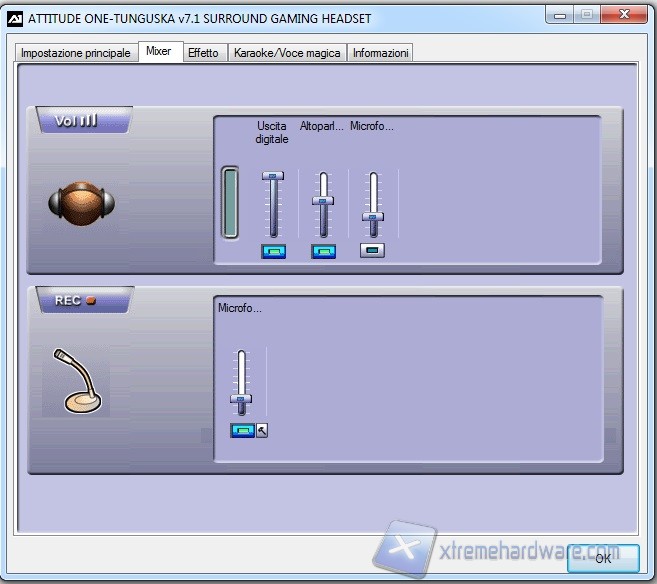 La tab “Mixer” ci permetterà di agire sul microfono e sul volume delle cuffie. È presente anche una regolazione per la registrazione dei suoni tramite il microfono.