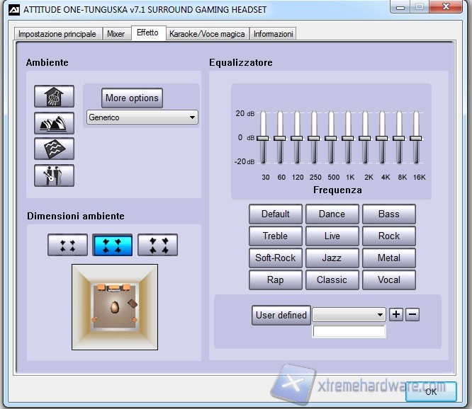 La tab “Effetto” ci permetterà di personalizzazire ai massimi livelli il tipo di ambiente o la dimensione della “stanza” da simulare oltre che regolare tramite un equalizzazatore il tipo di riproduzione in corso. Insomma potremo divertirci a personalizzare ogni impostazione.