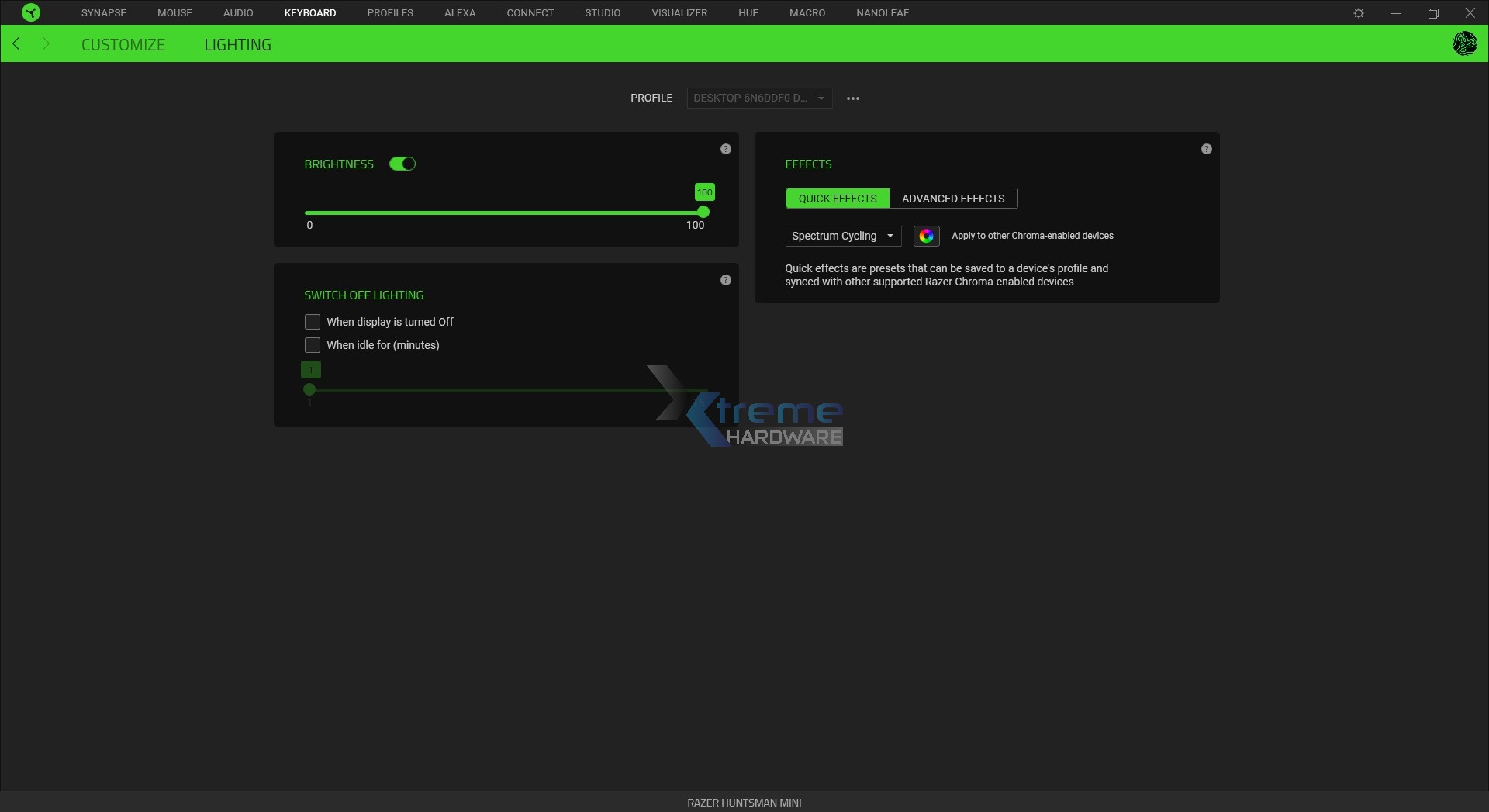 Il secondo e ultimo menu è ‘’Lighting’’. Qui potremo configurare e personalizzare l’illuminazione RGB Razer Chroma. La Huntsman Mini è compatibile in modo tale da sincronizzare effetti e illuminazione con altri prodotti/periferiche Razer e creare un ecosistema RGB completamente controllabile.