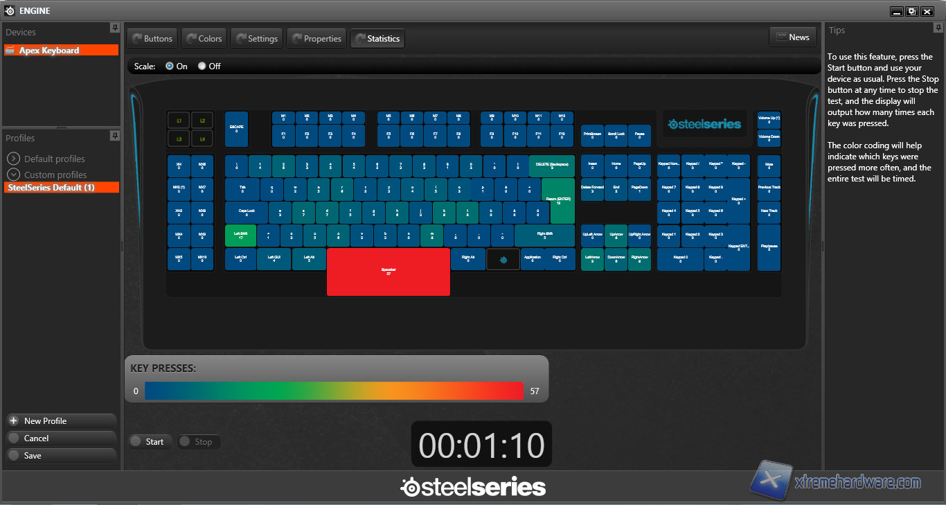 Le ultime 3 schermate ci permettono la regolazione del Polling Rate della porta USB, il layout, l'accoppiamento di un profilo con un'applicazione e un simpatico test che ci indica il numero di pressioni registrate da ogni tasto durante il test.