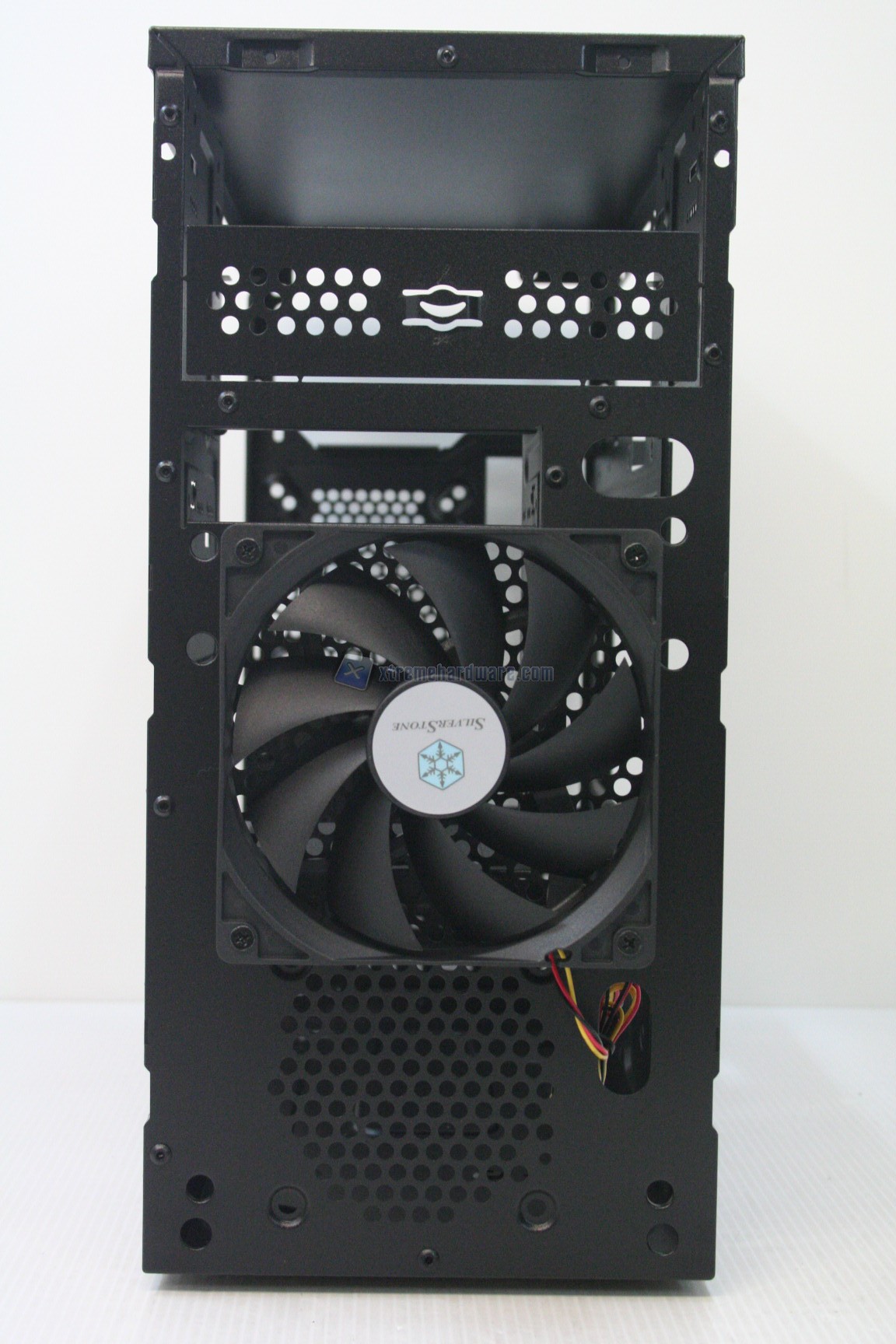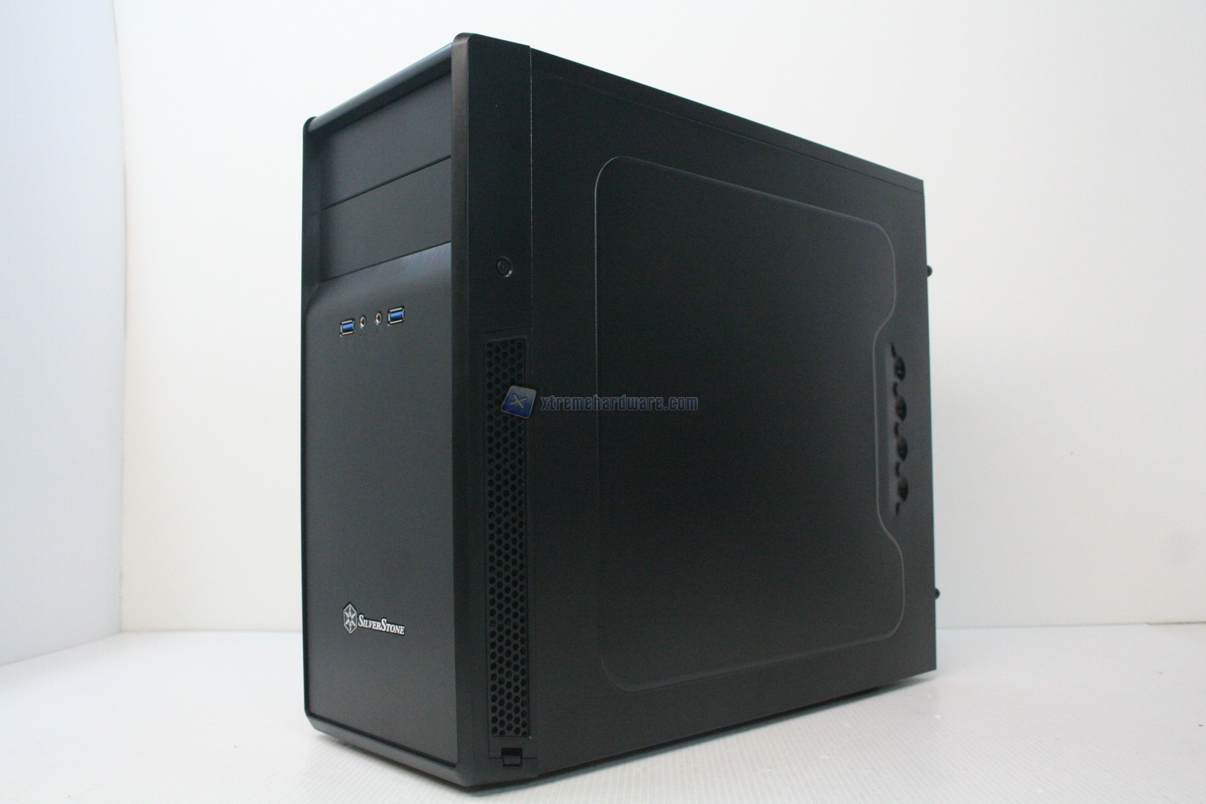 La versione che abbiamo ricevuto è l’unica in commercio ovvero integralmente nera. L’impressione iniziale è mista. Da una parte le dimensioni complessive giocano a favore dell’unità, che oltretutto è leggerissima, dall’altra l’utilizzo di plastiche nel frontale può far storcere il naso a più di qualcuno. Comunque sia, le plastiche sono rigide ed il telaio del chassis è in acciaio. Precisiamo che lo spessore delle paratie è elementare, diversamente da molti altri modelli SilverStone di fasce più alte di prezzo, ma appunto è proprio questo l’elemento da tenere in forte considerazione. Nel complesso, sebbene non presenti la solita qualità SilverStone, si può rimanere soddisfatti. Le linee artistiche sono eleganti ed è presenta una finitura in finto acciaio spazzolato. In compenso la verniciatura delle paratie è ottima, uniforme e nient’affatto scadente nemmeno all’interno, come invece succede in molti altri modelli della concorrenza. Oltre al fumo quindi, in questo caso, troviamo anche dell’arrosto (alle due di notte, orario in cui sto scrivendo, parlare di arrosto mi ha fatto venire abbastanza fame. Se poi consideriamo che i due revisori tecnici, mozart e luna, stanno diventando terribilmente simili a cognigli da forno, per via del loro crescente peso, l’attacco famelico del recensore notturno si fa sentire ! ). D’accordo, mettiamo da parte l’arrosto e andiamo al succo, o meglio, al contenuto. Insomma, procediamo!