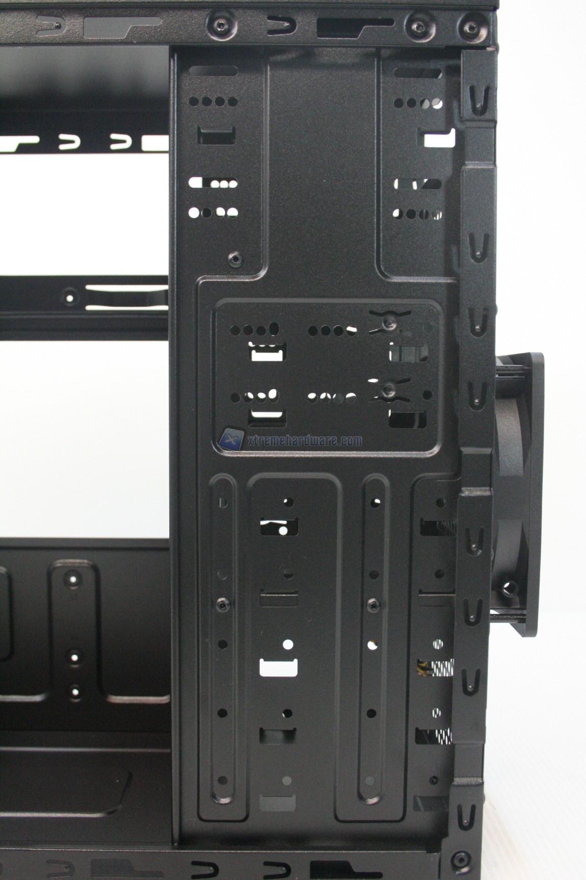 C’è una configurazione classica, zero fori di ventilazione ma quattro piedi con rivestimento gommato antivibrazioni e antigraffi per il parquet. Non sarà possibile installare rotelle ma sarà possibile installare un disco da 2.5” nella parte inferiore, come abbiamo fatto nel corso della recensione. Non c’è il supporto per ventole accessorie. I quattro supporti sono di altezza superiore allo standard, favorendo il pescaggio di aria dal basso e limitando l’ingresso della polvere. Sarà quindi possibile posizionare il cabinet anche su una moquette o un tappeto.