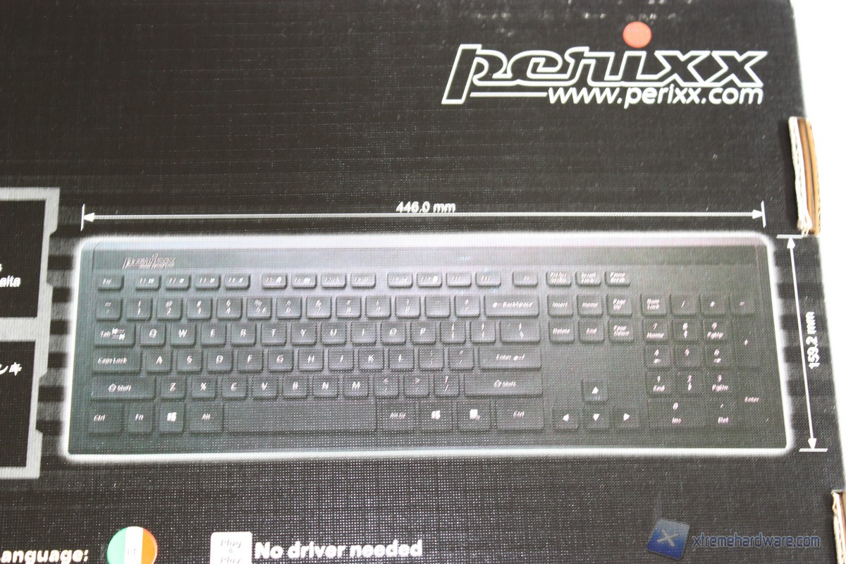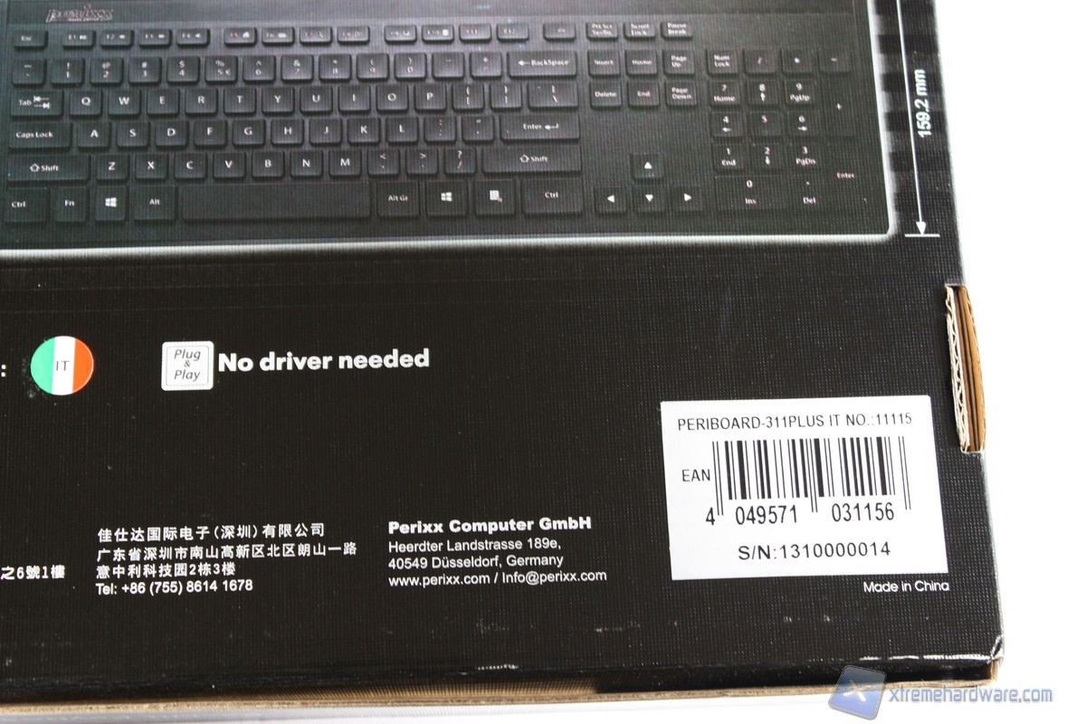 Nella parte posteriore troviamo un’altra immagine della tastiera, questa volta accompagnata dalle dimensioni e dall’elenco completo delle features della Perixx Periboard 311 Plus, tra cui il meccanismo dei tasti Scissor e la pesenza di HUB USB integrato. Non mancano informazioni relative alla compatibilità del prodotto con i piùrecenti sistemi operativi, l’interfaccia USB Plug n Play che ci consentirà di utilizzare la tastiera senza l'ausilio di software o driver dedicati. Inoltre èriportato il layout della tastiera che è IT, ovvero italiano.
