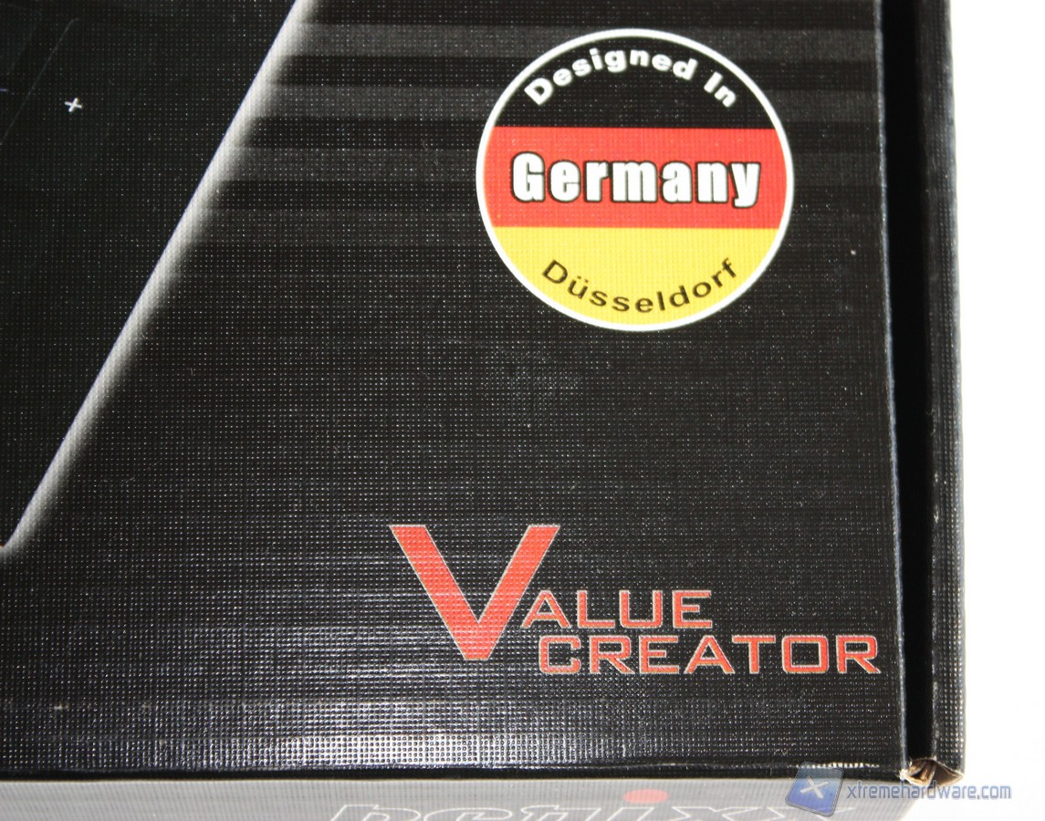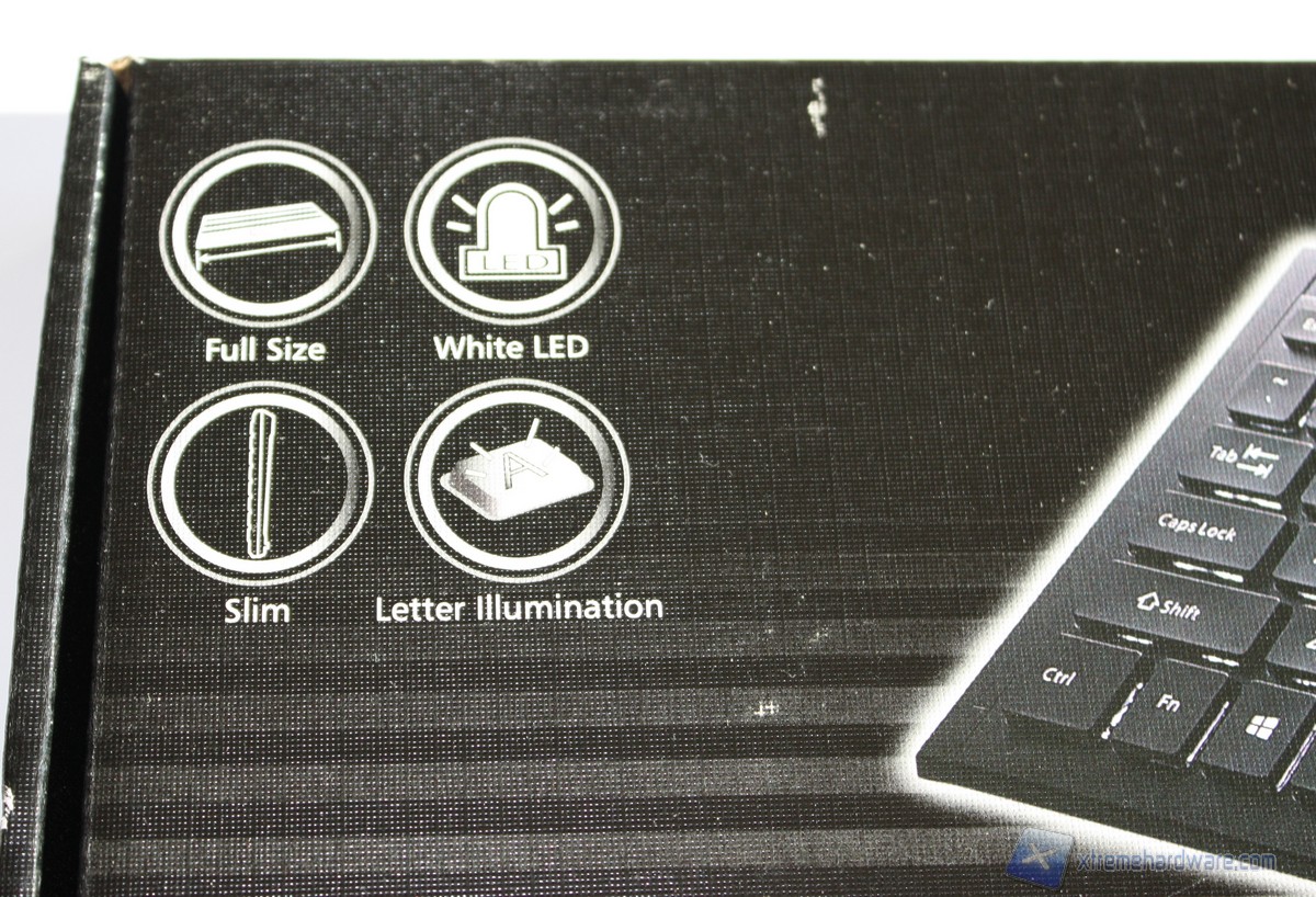 La scatola in cui troviamo la tastiera è di colore nero con rifinitura lucida, sulla quale possiamo notare alcune specifiche tecniche. Frontalmente troviamo una grande immagine della tastiera che pone in particolare risalto la retroilluminazione bianca mentre, in alto a sinistra, troviamo riportate le principali features della tastiera. Un bollino sulla parte laterale del frontale ci dice che la tastiera è stata prodotta a Düsseldorf.