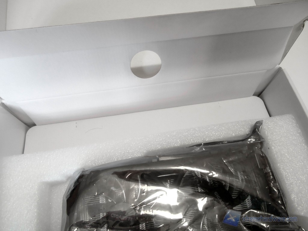 Aprendo la scatola notiamo al centro, incastrata nell’imbottitura, la scheda grafica avvolta nel sacchetto antistatico. Inoltre possiamo vedere che all’interno non troviamo nessun bundle. Molto probabilmente la scheda in versione retail sarà fornita del classico bundle gigabyte, che comprende: CD driver, foglietto illustrativo, CrossfireX bridge e un adattatore molex-6 pin PCI-E.