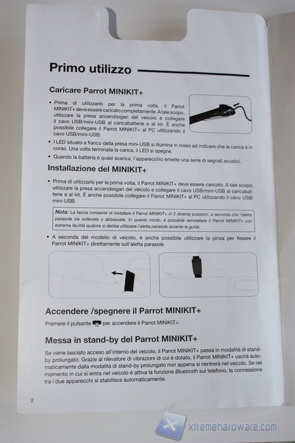 A seguire illustriamo le pagine che compongono la Guida d’uso al Parrot MINIKIT+.La Guida d’Uso è in Italiano e ci illustra nonché riassume in pochi semplici passi le funzionalità principali del Parrot MINIKIT+. La guida risulta essere facilmente consultabile da chiunque senza problemi.