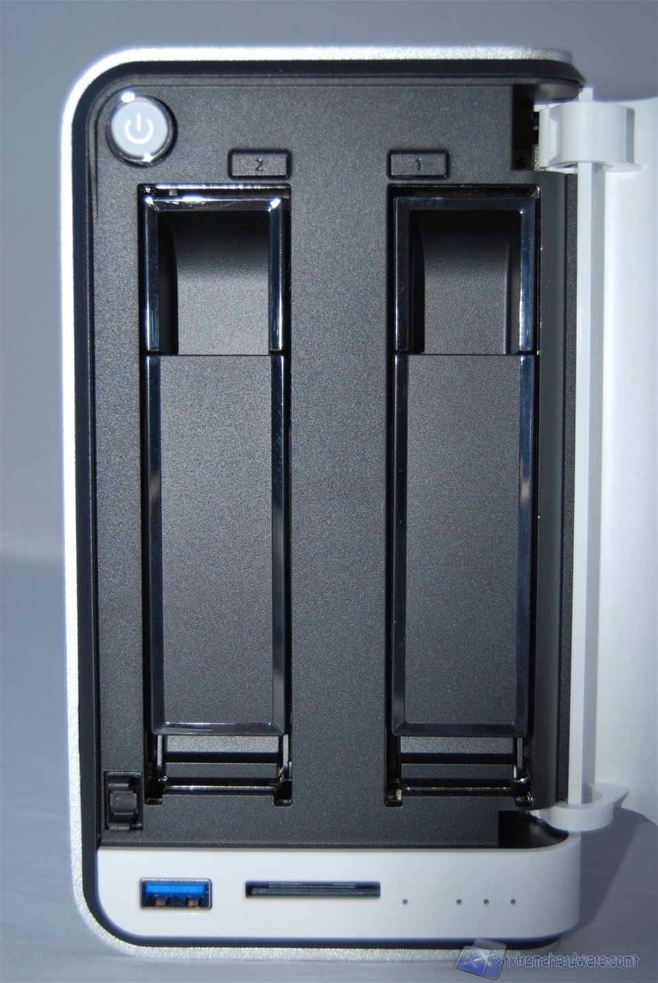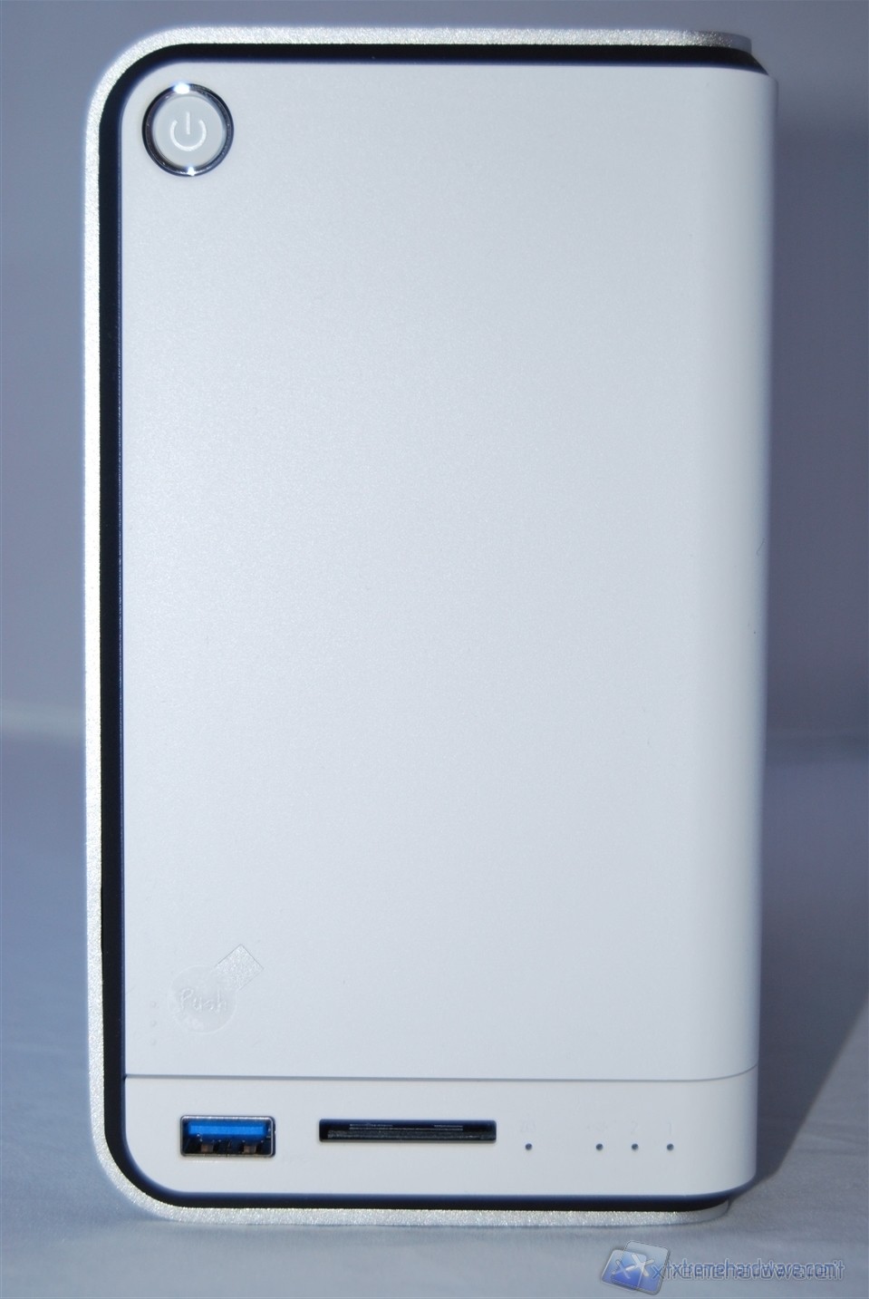 In basso troviamo la porta USB 3.0 caratterizzata dal classico colore blu, il lettore di schede SD e cinque LED che indicano l’accensione, lo status dell’HDD1, dell’HDD2, del lettore di schede e delle USB.