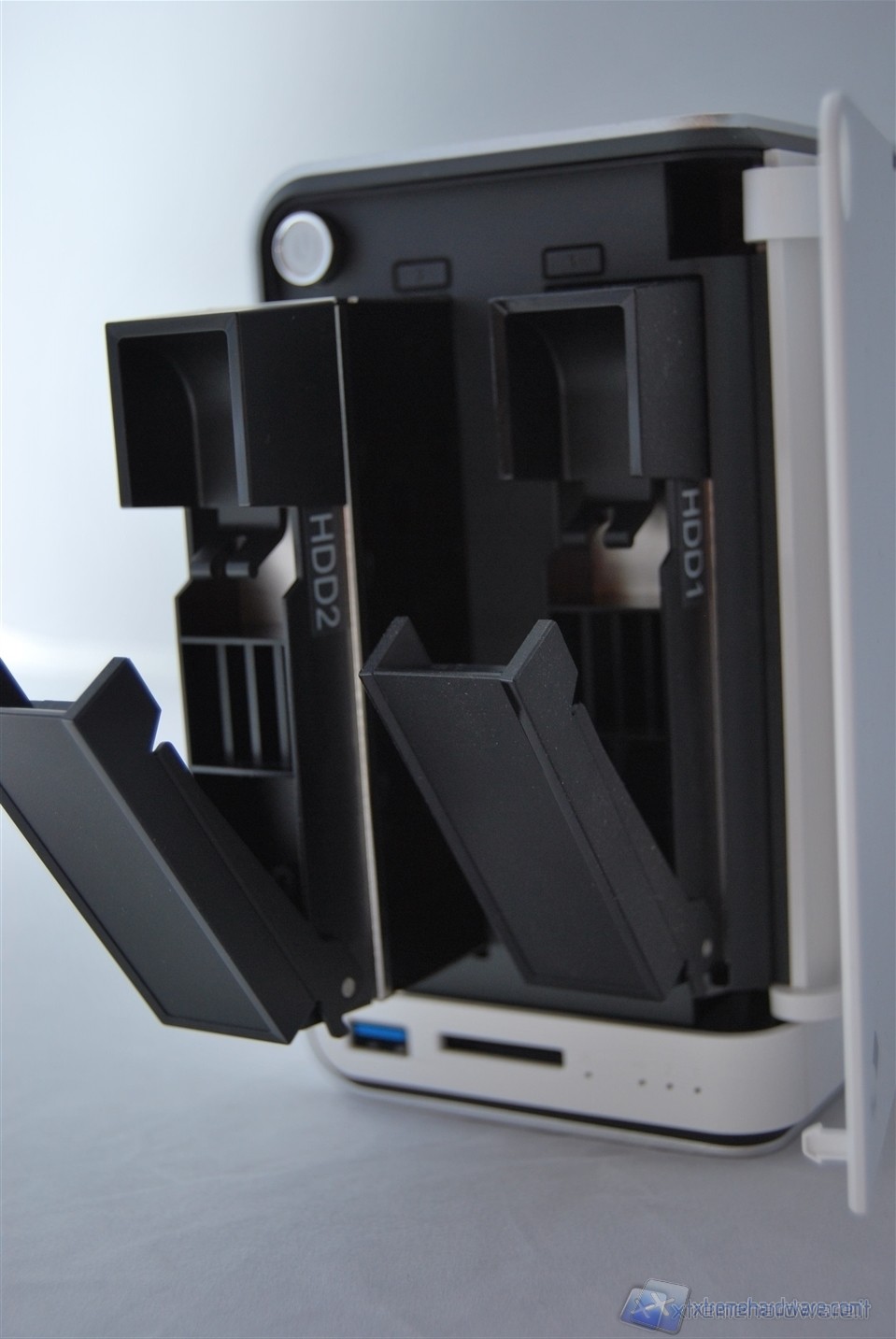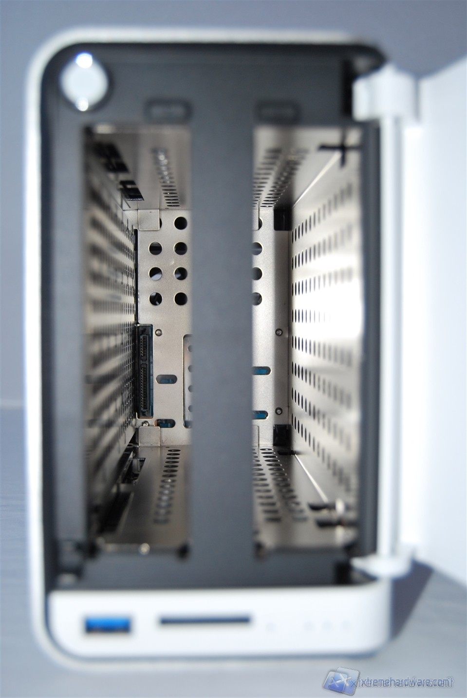 La parte frontale presenta un tasto tondo di accensione utile anche per la funzione “hot swap”; basta infatti premere quel pulsante per poter sostituire uno dei due drive che si trovano alloggiati nei due bay dietro lo sportello in alluminio bianco che troviamo sul frontale.