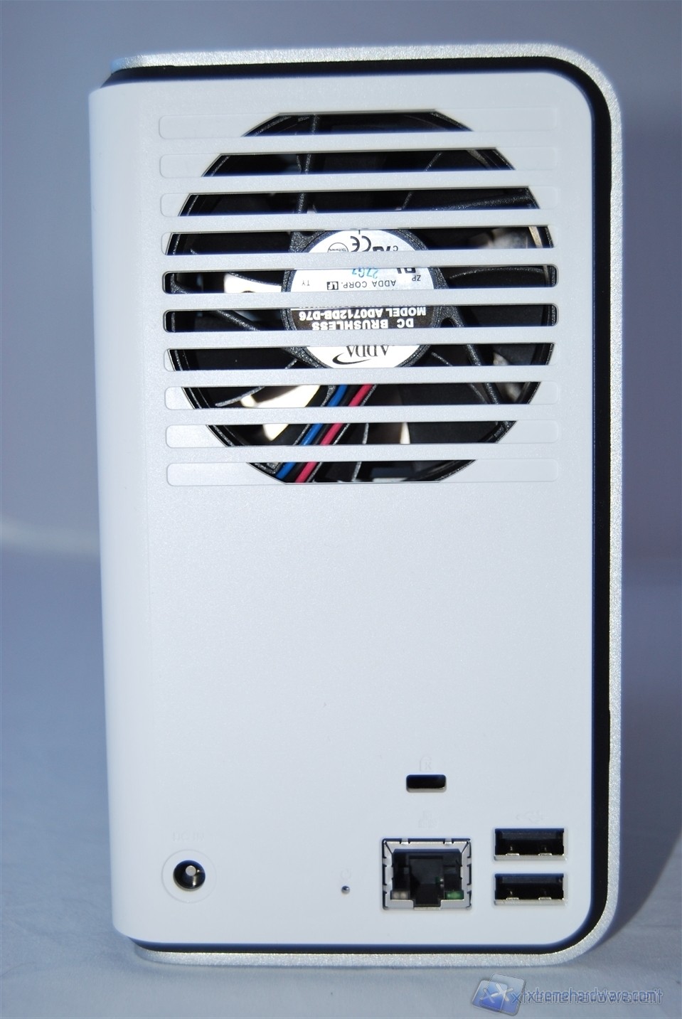 Il retro è caratterizzato da una ventola in estrazione che viene attivata soltanto qualora la temperatura raggiungesse i 54°C, una porta LAN RJ45, due porte USB 2.0 e un connettore Kensington utilizzabile con un cavo di sicurezza per impedirne il furto.